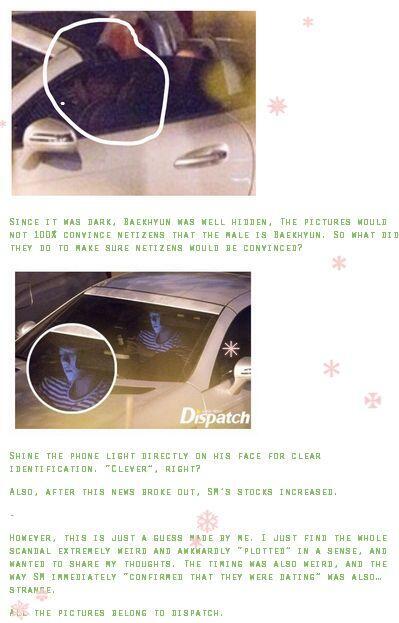 Saya merasa ada kejanggalan dari skandal ini. Baekhyun dan Taeyeon seperti sudah menyadari adanya sesosok paparazzi disana, tapi mereka bersikap tak acuh. mereka dengan santainya bermesraan di dalam mobil dan tanpa memakai penyamaran apapun (masker, topi, kacamata, dll) oh dan lebih parahnya lagi, mereka membuka atap mobilnya dan BERCIUMAN. Dan dengan mudahnya SM mengkonfirmasi hal itu dalam waktu kurun dari 3 jam. semudah itukah?